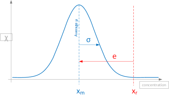 Detail der Wahrscheinlichkeitsverteilung χ of eines verrauschten Signales um den Mittelwert xm in Relation zu der realen Konzentration xr mit dem Messfehler e:
